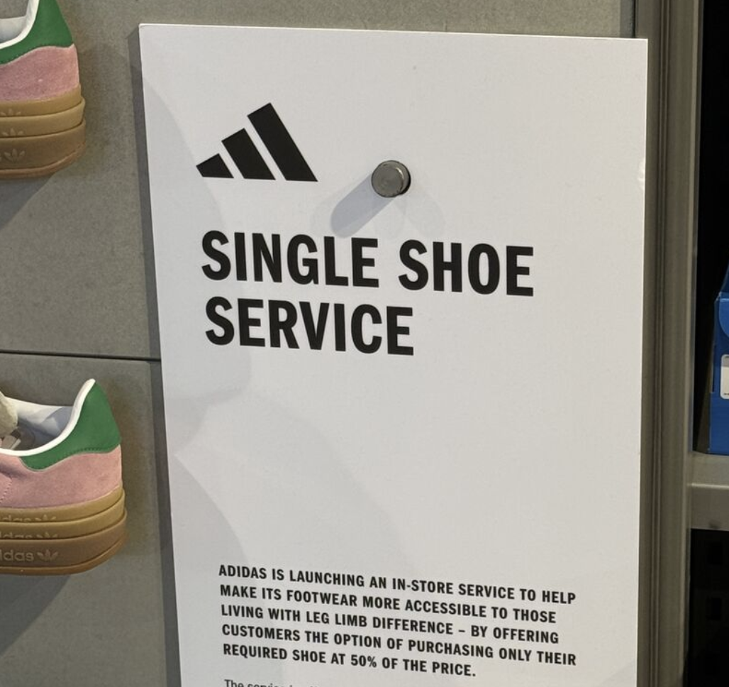 Adidas has introduced a new single shoe purchase service across its own retail stores in Europe, allowing customers with limb difference to buy only the shoe they need instead of being required to purchase a full pair. The initiative is intended to improve accessibility for people living with amputation, limb loss, or other conditions where only one shoe is required.