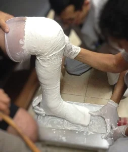 After reviewing and participating in the fabrication of over a thousand Neuro Swing AFOs, I can affirm that the frontal plane is the most critical aspect of the casting procedure. Here, the correct alignment ensures the proper mechanical function of the ankle joint and its durability. Adopting the traditional casting method in a seated position without the correct alignment reference in weight bearing at midstance can result in fracturing the stirrup due to the decisive moment of force created by unbalanced forces. The accurate alignment and gait posture are reflected during midstance and terminal stance through the center of mass and ground reaction forces.
