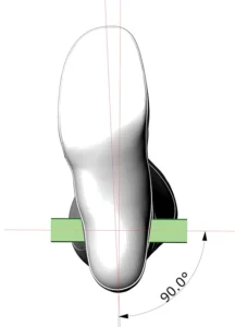 At midstance, the tibia is inclined by 10-12 degrees according to Owen et al. This is also known as the shank vertical angle. The tibia inclination stabilizes the knee, hip, and trunk. At this plane, the shoe is an important external biomechanical element, so it is imperative to include the correct shoe pitch.10 The difference between the heel height of the shoe and the anterior sole thickness determines the height of the casting plate and the proper fit of the orthoses in the shoe. A cast with a flat foot section obtained over the floor is unacceptable and creates issues during the dynamic alignment and fit in the shoe.