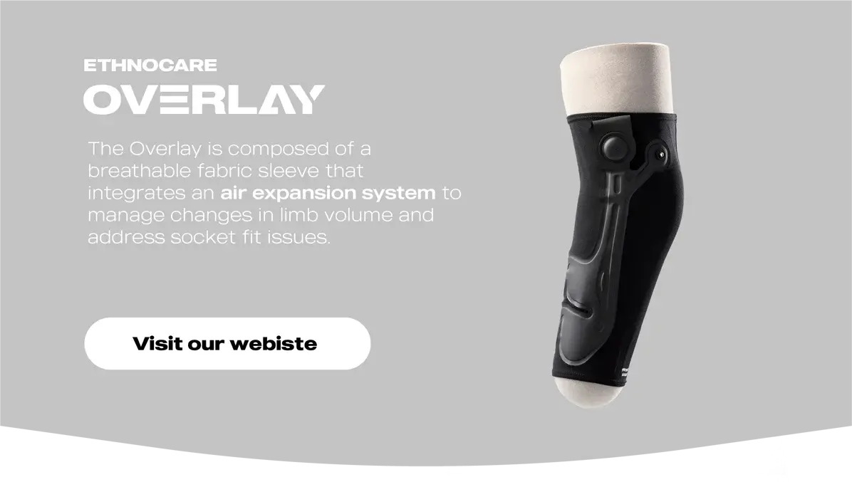 Ethnocare has developed the Overlay as a universal add-on system designed to adapt to residual limb changes while maintaining alignment and stability. Rather than relying solely on sock layering or rigid socket modifications, the device uses controlled air expansion to provide customizable comfort and fit adjustments throughout the day.