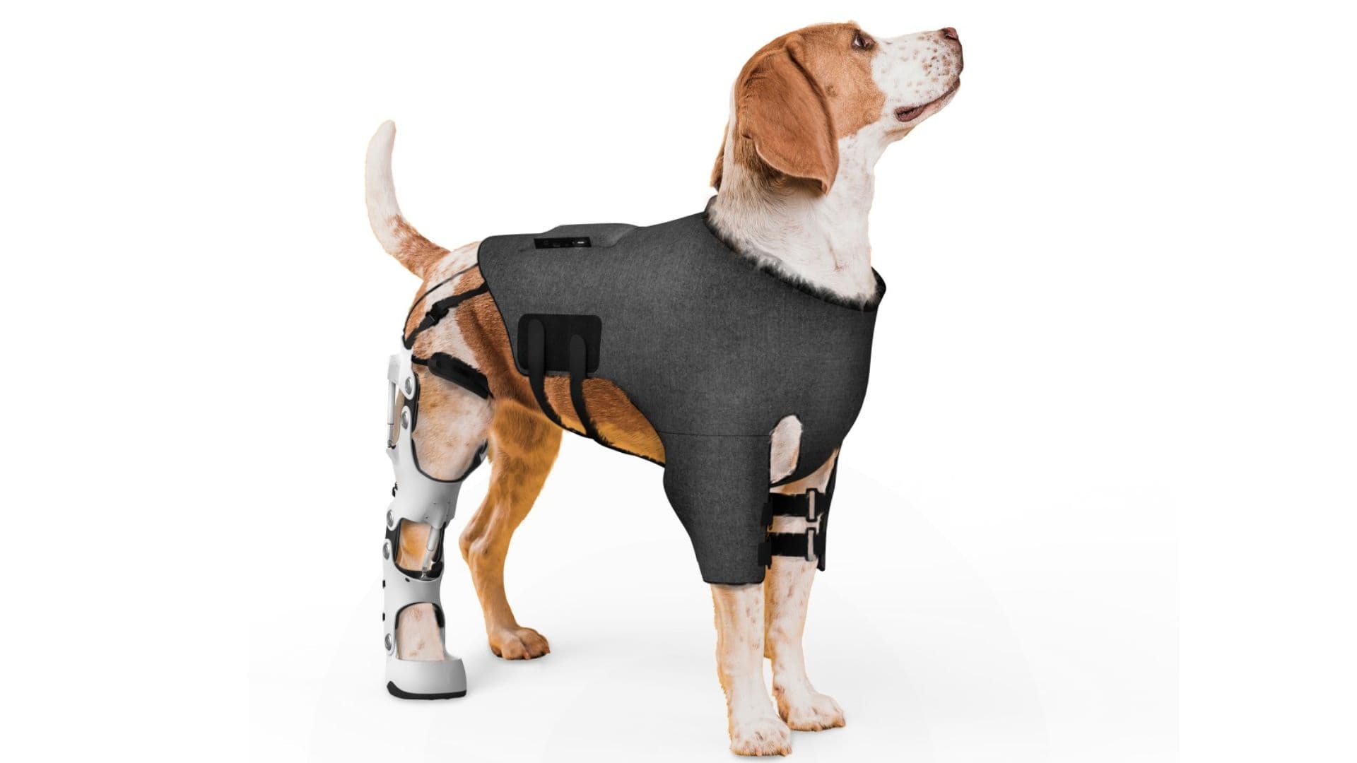 The attachable device listens to a dog’s movement and moves hind legs in sync, reducing stress and aiding recovery.